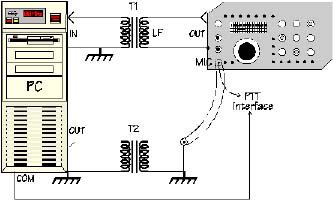 But there are much cheaper ways to get a good transformer. In most modems you will find transformers to isolate the modem from the telephone line. So get some of these old modems on the local flea market and remove the transformers from the card. The transformer is not a critical component. Your transceiver probably has a high impedance input and your soundcard a low output impedance. If you have difficulty getting a decent LF level, swap primary and secondary windings. You will need a second transformer for the AF output from your rig to the PC's soundcard line input. See figure 1.