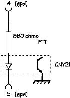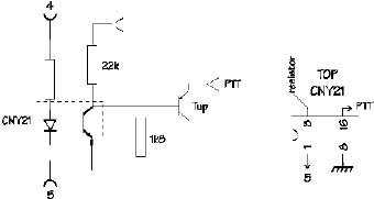 So I choose the optocoupler; the one I found in the files was a CNY21. This optocoupler doesn't require a bias or threshold level on the transistor's base. So you only have four pins on the DIL16 package, which fits easily in a 9-pin D-connector case. Have a look at figure 2. This is really all you need to interface the PTT of your rig to the PC! The pin numbers (4&5) are the pins of your 9-pin D connector for the COM port on your computer.
